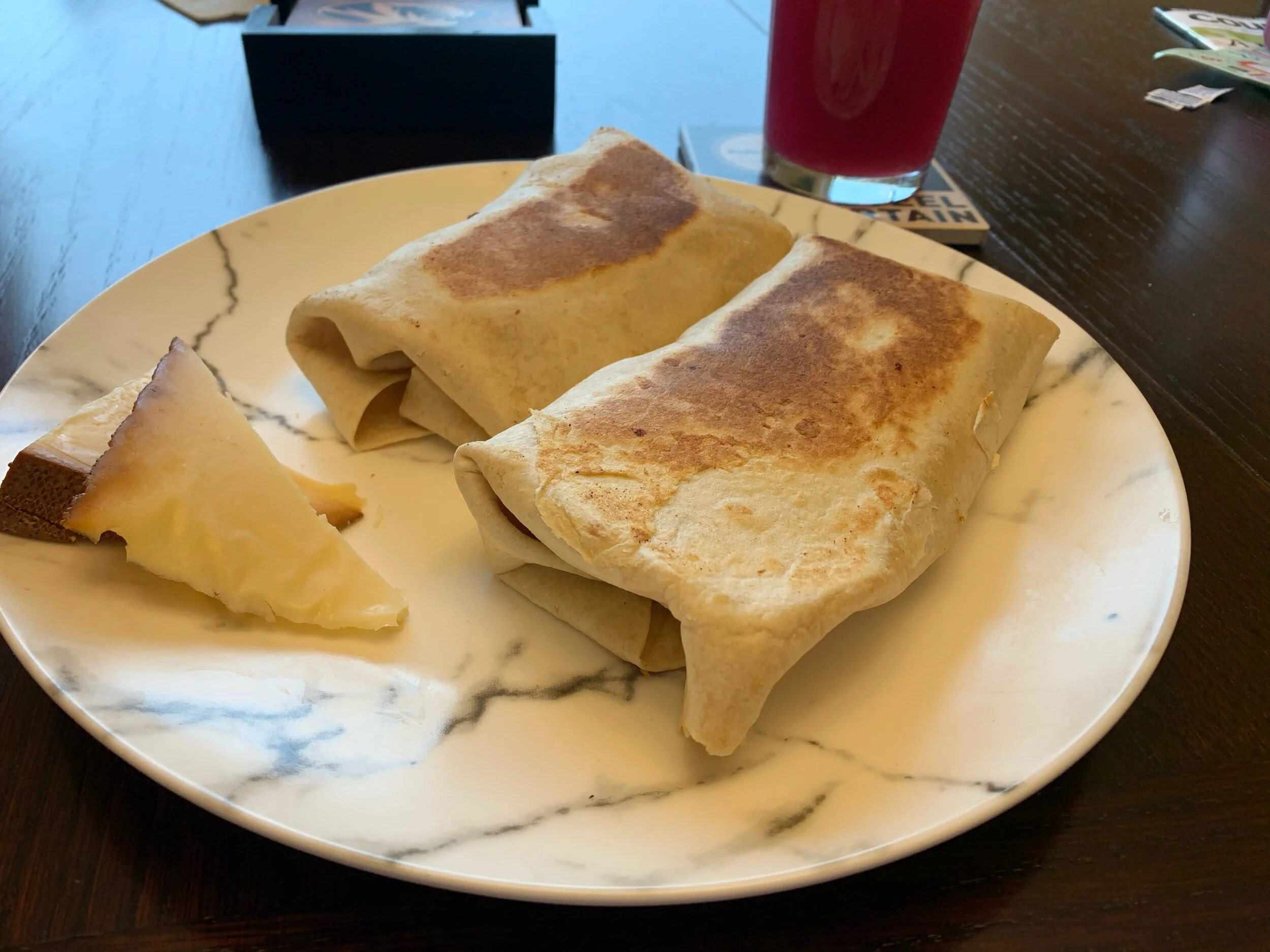 The sleep was a powerhouse. Barely any interruptions and kept dragging on. A true weekend morning. A blip at five led to a blip at six thirty which led to waking up at half seven. The ability to just roll over and get the sleep you want is a treat that I recognize as special. I spent another hour lazing about and listening to podcasts before showering my day into existence. Since I’d forgotten to get chorizo sausage for the weekly scramble, I had to settle for some sliced up sausage patties this week. I also had some smoked Gouda with it. That added a very new element and I was glad I had the tartness of the blueberry lemonade to cut the richness of the dish overall. It was a great start to the day.