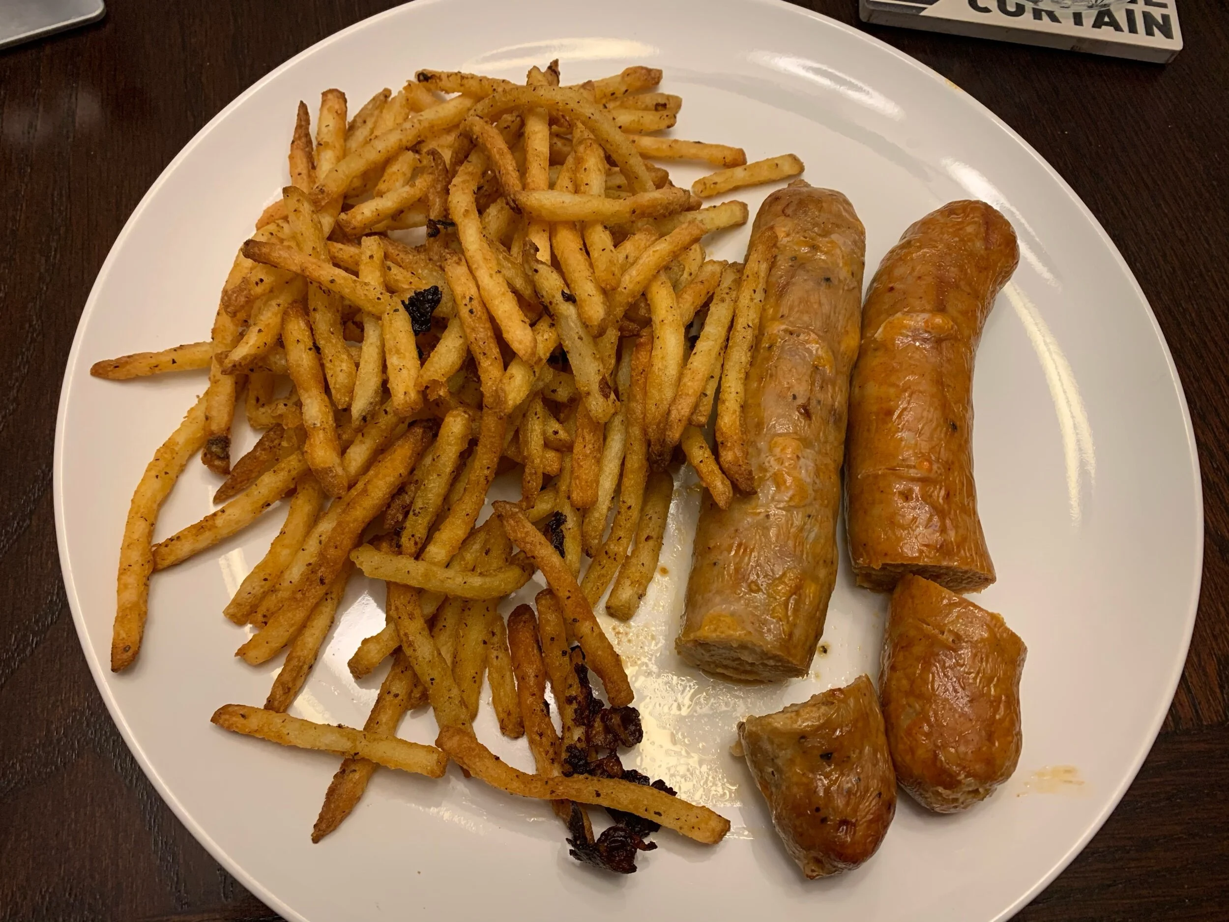 The meetings wrapped up at five and after another half hour or so of cleaning some issues I wandered down to the kitchen to follow up my elaborate lunch. The meal planning board said I should make bangers and chips. Mostly because I don’t have the stuff to make mash. I used the air fryer to quickly blast a package of sausages into submission. Actually, it was parts of a couple packages. You can see a hot italian on the right and a bacon and cheddar butcher style on the left. This is about one third of the fries I cooked. It took a couple batches and was annoying. With really working the air fryer so hard for this meal the kitchen got a bit of a stick to it. I turned on the super weak kitchen fan to fix it and descended out of the carnage.