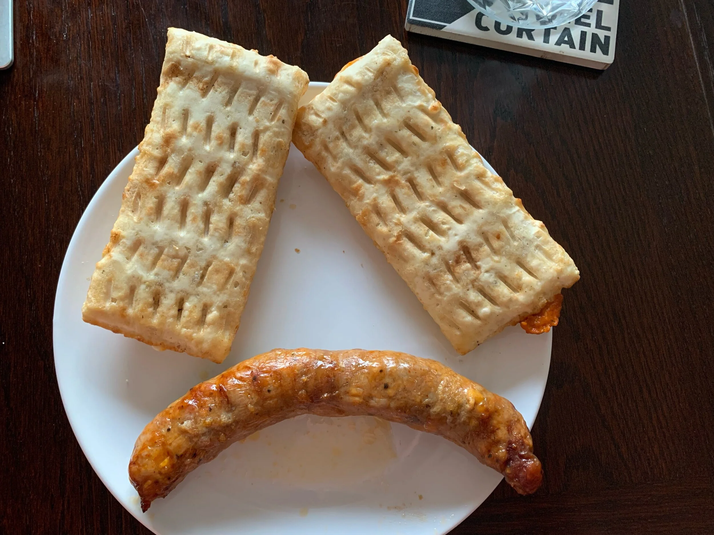 From here I should have went in the garage and started working on clearing out more foam but instead I went downstairs and fired up Farm Simulator 19. Many more hours were invested into my electronic farm. I ended up buying two smaller adjacent fields and combining them into one as my crops I planted yesterday matured. They are close to my existing lands. I’m not sure what inspired that effort. Either way, the most of the afternoon was spent at that pleasure. When I felt I’d had enough I saved it off and moved to my room to dabble at some HomeScapes. It wasn’t long before I felt I should eat again so I made a very simple meal of some Stouffer’s Bistro Crustini Mozzerella and Meatball panini and a sausage. I had to arrange them to fit on the small plate. I noticed it looked like how most people would regard the meal.